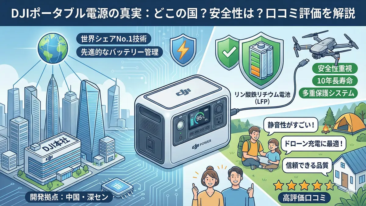 「DJIのポータブル電源って気になるけど、どこの国のメーカーで安全性は大丈夫なのかな?」 この記事では、ドローンで有名なDJIが販売するポータブル電源の製造国から、安全性、実際の購入者の口コミまでを網羅的に解説します。 この記事でわかること DJI... -