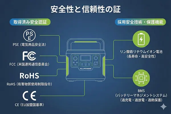 ALLPOWERSのポータブル電源は、日本の電気用品安全法に基づくPSE認証を取得しています。