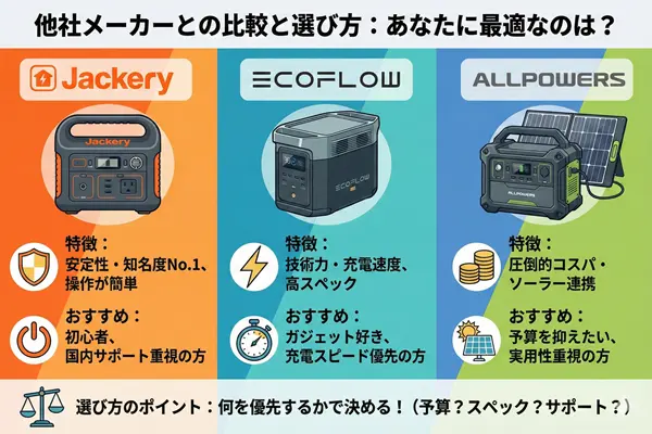 - Jackeryは安定性、EcoFlowは技術力、ALLPOWERSはコストパフォーマンスとソーラー連携に強みがある