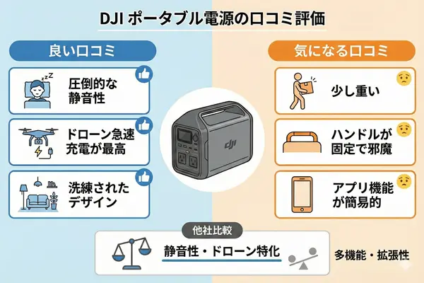 他社製品が容量拡張やアプリ機能に力を入れているのに対し、DJIは「静音性」と「独自の給電性能」に特化していることがわかります。