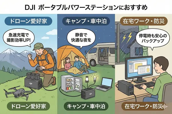 これまでの特徴や評価を踏まえて、具体的にどのような人にDJIのポータブル電源が適しているのかを整理します。