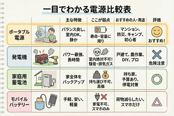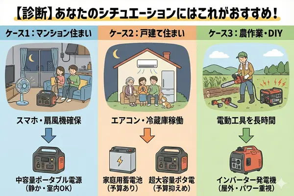 特殊な用途(長時間DIY)や、潤沢な予算(全館バックアップ)がある場合を除けば、ほとんどの一般家庭にとってポータブル電源が最もバランスの取れた選択肢です。