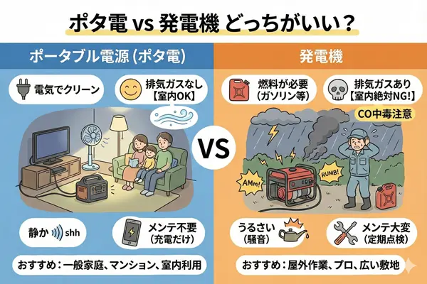 しかし、「どこで使うか」と「誰が管理するか」を考えた時、多くの一般家庭にとって発電機はリスクが高すぎる選択肢になります。その決定的な違いを3つのポイントで解説します。