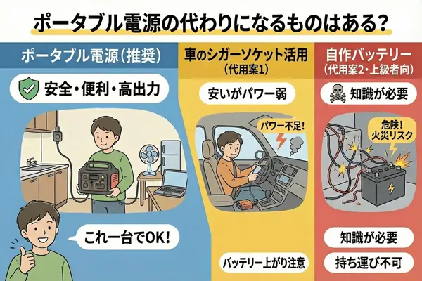 そう考える方のために、ポータブル電源の代用としてよく挙げられる2つの手段を紹介します。