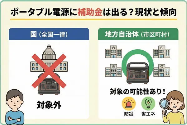 ポータブル電源を買うと国からお金がもらえるという噂を耳にしたことがあるかもしれません。しかし、結論から言うと、誰もが無条件で受け取れる全国一律の補助金は存在しません。